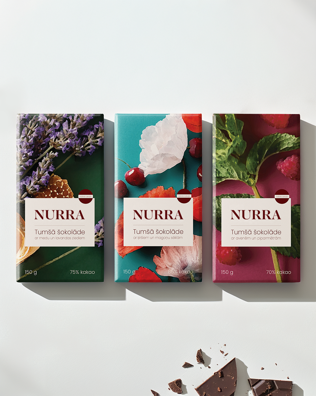 Iepakojuma dizains tumšās šokolādes zīmolam “NURRA”. “NURRA” sastāvdaļas ir kombinētas tā, lai radītu ne tikai unikālu garšas pieredzi, bet arī sniegtu maigu labvēlīgu ietekmi uz labsajūtu.
